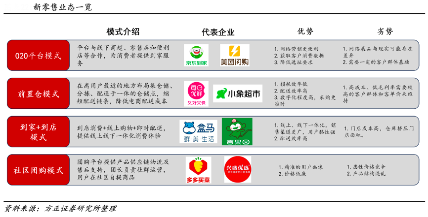 經(jīng)典案例:根據(jù)方正證券研究所等綜合資訊表明,隨著新零售業(yè)態(tài)的不斷發(fā)展,目前主要有以下四種新零售業(yè)態(tài):以京東到家、美團(tuán)閃購(gòu)為代表的 O2O 平臺(tái)模式,以每日優(yōu)鮮、小象超市為代表的前置倉(cāng)模式,以盒馬生鮮和百果園為代表的到家+到店模式與以多多買菜和興盛優(yōu)選為代表的社區(qū)團(tuán)購(gòu)模式,四種模式各有優(yōu)劣,目前零售行業(yè)呈現(xiàn)多種模式共存的現(xiàn)象。