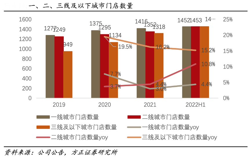 經(jīng)典案例:根據(jù)公司公告、方正證券研究所等綜合資訊表明,由于下沉市場(chǎng)中本地水果店的采購(gòu)規(guī)模小,中間代理環(huán)節(jié)多,同等品質(zhì)的水果在這里的加價(jià)率更高,因此百果園在下沉市場(chǎng)的發(fā)展空間廣闊。三線及以下城市門店數(shù)量由 19 年的 949 家增長(zhǎng)至 22 年 H1 的 1456 家,復(fù)合增速達(dá) 13%。