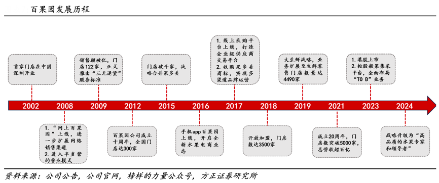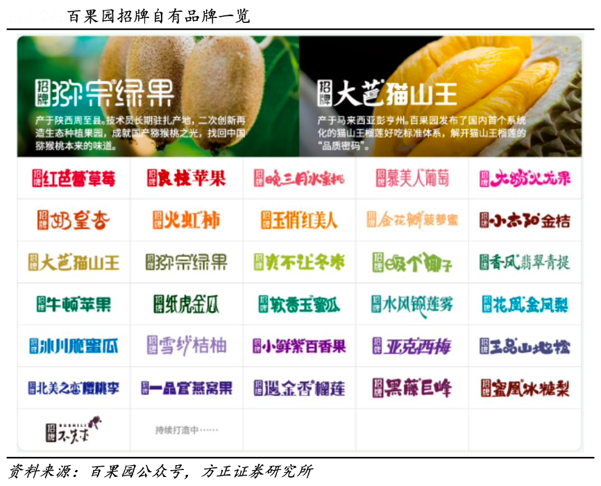 經(jīng)典案例:根據(jù)公司公告、公司官網(wǎng)、榜樣的力量公眾號(hào)、方正證券研究所等綜合資訊表明,百果園業(yè)務(wù)多元化發(fā)展,品牌戰(zhàn)略升級(jí)。2019 年發(fā)布“大生鮮” 戰(zhàn)略, 2023 年公司于港股上市,并控股般果平臺(tái),全面布局“To B”業(yè)務(wù)。2024 年品牌戰(zhàn)略升級(jí)為“高品質(zhì)的水果專家和領(lǐng)導(dǎo)者”,計(jì)劃十年內(nèi)營(yíng)收達(dá)到千億級(jí)別。