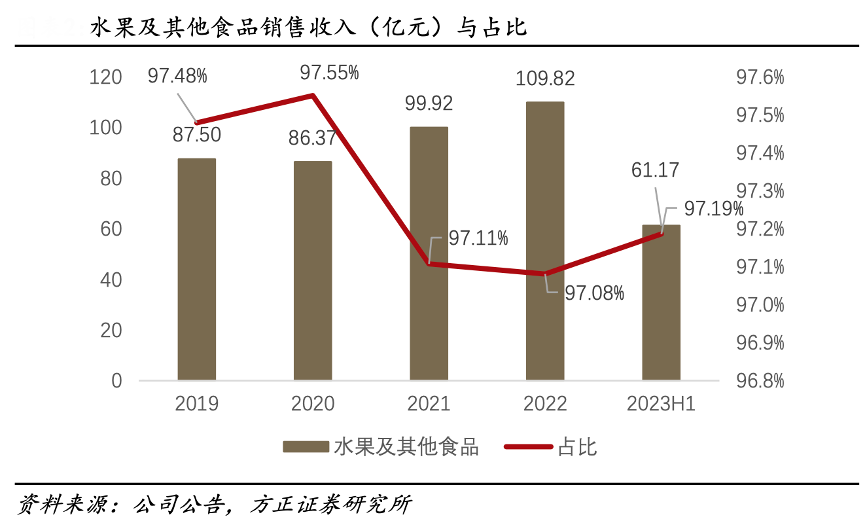 經(jīng)典案例:根據(jù)公司公告、方正證券研究所等綜合資訊表明,百果園公司的產(chǎn)品銷售以水果及其他食品為主。2019 年到 2023 年 H1 水果及其他食品 的銷售收入占比達(dá)到 97%以上,百果園擁有業(yè)內(nèi)獨特的四級果品品質(zhì)分級體系,招牌果與 A 級的高端水果的銷售占比逐年穩(wěn)步提升,至 2023 年 H1 招牌果和 A 級 果銷售收入占比之和達(dá)到 67%。