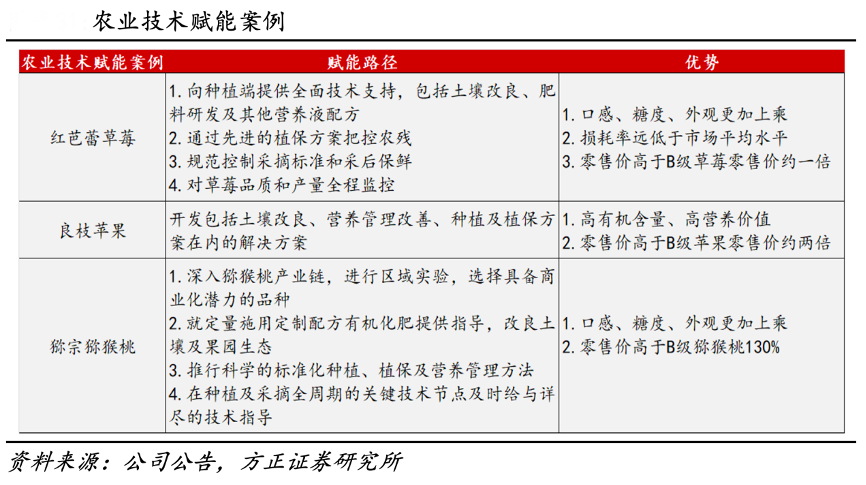 經(jīng)典案例:根據(jù)公司公告、方正證券研究所等綜合資訊表明,百果園通過向合作的種植基地推廣種植理念和種植與采后技術(shù),幫助種植基地培育優(yōu)質(zhì)果品,提升產(chǎn)量。百果園也以資本賦能擴大優(yōu)質(zhì)基地的生產(chǎn)規(guī)模,獲得優(yōu)質(zhì)果品的優(yōu)先采購權(quán),確保大規(guī)模供應,并給予從龐大的銷售網(wǎng)絡獲取的市場信息,指導種植基地進行品種的改良與創(chuàng)新。