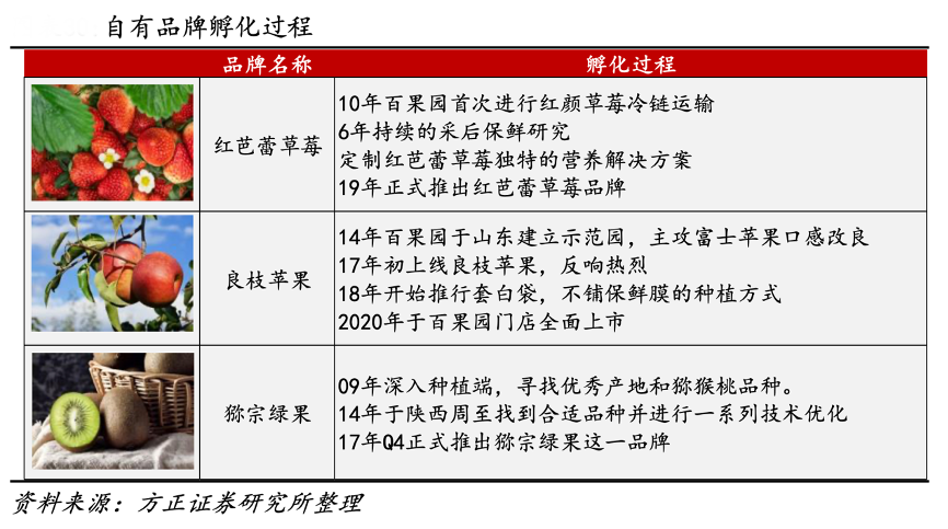 經(jīng)典案例:根據(jù)方正證券研究所等綜合資訊表明,以紅芭蕾草莓、良枝蘋果、獼宗綠果為例,這三款自有品牌招牌果在全面上市之前都經(jīng)歷多年培育、調(diào)整、優(yōu)化,紅芭蕾歷時九年,良枝蘋果歷時六年,獼宗綠果歷時八年。百果園深耕水果行業(yè)多年,在種植技術(shù)、品種選取、運輸倉儲等方面積累了豐富經(jīng)驗,助力百果園的自有品牌孵化。