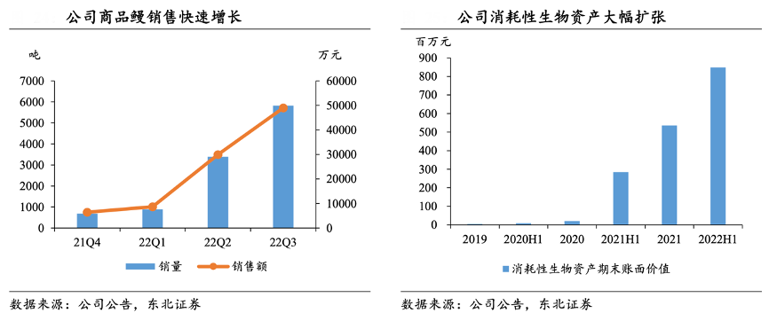經(jīng)典案例:根據(jù)公司公告、東北證券等綜合資訊表明,2021年以來天馬科技公司鰻魚養(yǎng)殖規(guī)??焖贁U(kuò)張,當(dāng)期新增鰻魚銷售收入 6440 萬元,毛利率達(dá)到 48.1%。2022 年公司鰻魚養(yǎng)殖業(yè)務(wù)出 塘節(jié)奏加快,前三季度鰻魚銷量為 5819 噸,實(shí)現(xiàn)鰻魚收入 4.9 億元。截止 2022 年 上半年,公司消耗性生物資產(chǎn)已經(jīng)達(dá)到 8.5 億元。