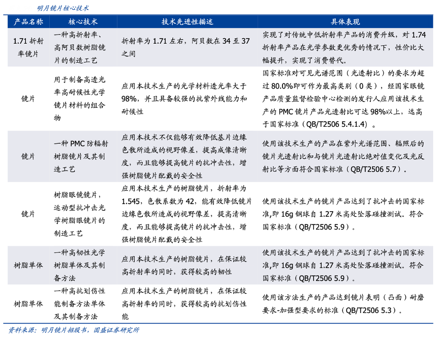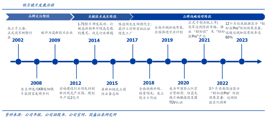 經(jīng)典案例:根據(jù)公司年報、公司招股書、公司官網(wǎng)、國盛證券研究所等綜合資訊表明,明月鏡片是專業(yè)從事鏡片研發(fā)與生產(chǎn)的國內(nèi)鏡片行業(yè)領(lǐng)軍者。公司業(yè)務(wù)主要涵蓋樹脂原料、樹脂鏡片、鏡架及成鏡等眼視光產(chǎn)品的研發(fā)、生產(chǎn)及銷售。公司歷經(jīng)初創(chuàng)、技術(shù)突 破和品牌升級三個階段,始終以研發(fā)為本,其原料、光學(xué)設(shè)計、實(shí)用功能和膜層等方面在國產(chǎn)品牌中占據(jù)優(yōu)勢,目前已成為國內(nèi)領(lǐng)先的綜合類眼鏡鏡片生產(chǎn)商。