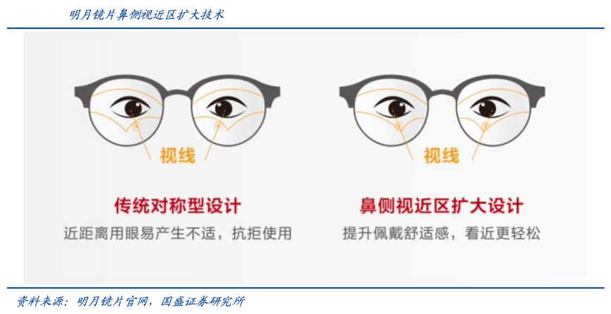經(jīng)典案例:根據(jù)明月鏡片官網(wǎng)、國(guó)盛證券研究所等綜合資訊表明,明月鏡片公司產(chǎn)品形態(tài)多元、貼近中國(guó)人用眼習(xí)慣及需求,推出的“輕松控”近視 防控產(chǎn)品采用非對(duì)稱的 Nasal Side 鼻側(cè)近視區(qū)擴(kuò)大設(shè)計(jì),更加符合中國(guó)孩子“長(zhǎng)時(shí)間近距離用眼”和“眼球內(nèi)旋”的生理特點(diǎn),提升佩戴舒適性、近視管理效果更佳。