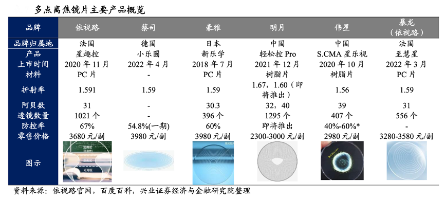 經(jīng)典案例:根據(jù)依視路官網(wǎng)、百度百科、興業(yè)證券經(jīng)濟(jì)與金融研究院等綜合資訊表明,目前,離焦鏡的主要品牌包括外資的依視路、蔡司、豪雅,及國(guó)產(chǎn)的明月、偉星,2021 年中,明月推出一代產(chǎn)品“輕松控”。二代技術(shù)多點(diǎn)離焦鏡片的代表產(chǎn)品是豪雅的新樂學(xué)及依視路的星趣控,豪雅新樂學(xué)一經(jīng)推出便受到市場(chǎng)歡迎,明月亦在 2021 年底推出二代產(chǎn)品“輕松控 Pro”。