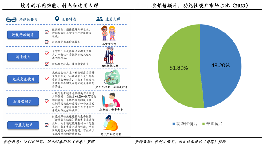 經(jīng)典案例:根據(jù)沙利文研究、國元證券經(jīng)紀(jì)(香港)等綜合資訊表明,功能性鏡片在普通鏡片的基礎(chǔ)上,通過調(diào)整材料、配方、設(shè)計或膜層,使得鏡片具有近視管理、抗疲勞、防藍(lán)光、成人漸進(jìn)等功能特性,以適應(yīng)不同的人群和 場合。根據(jù)沙利文研究,2023 年功能性鏡片的市場占比為48.2%。目前針對不 同適用人群和使用場景發(fā)展出的功能性鏡片包括:近視防控鏡片、漸進(jìn)鏡片、 光致變色鏡片、抗疲勞鏡片、防藍(lán)光鏡片等。