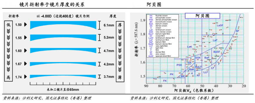 經(jīng)典案例:根據(jù)沙利文研究、國元證券經(jīng)紀(jì)(香港)等綜合資訊表明,對于鏡片而言,折射率反映了鏡片對光線的折射能力,同等條件下,鏡片折射率越高鏡片越輕薄,越能提高佩戴者舒適度。但由于光學(xué)原因,折射率越高會 導(dǎo)致鏡片色散系數(shù)(阿貝數(shù))越大,進(jìn)而導(dǎo)致鏡片成像不清晰,因此在制造鏡片 時,如何權(quán)衡折射率和清晰度的關(guān)系是廠商需要考慮的問題。