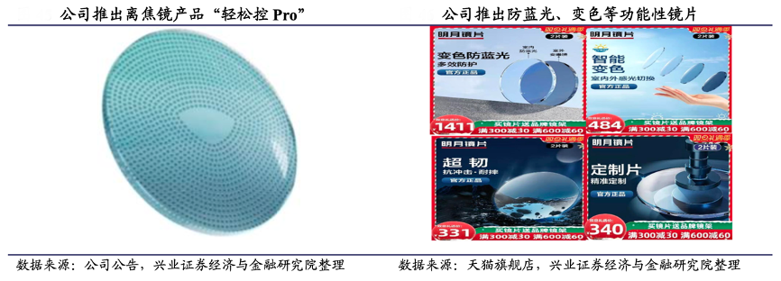 經(jīng)典案例:根據(jù)公司公告、天貓旗艦店、興業(yè)證券經(jīng)濟與金融研究院等綜合資訊表明,明月鏡片公司切入青少年近視防控賽道,聯(lián)合中國工程院莊松林院士團隊,于 2021 年 6 月推出青少年近視防控的一代產(chǎn)品“輕松控”,同年年底推出二代產(chǎn)品“輕松控 Pro”,分別采用周邊離焦眼軸控制技術(shù)(C.A.R.D) 及多點近視離焦眼軸控制技術(shù)(C.A.M.D),延緩青少年近視度數(shù)加深。該系列采 用公司自研的 PMC 超亮材料和 KR 樹脂材料,折射率 1.60 的近視防控產(chǎn)品的阿貝數(shù)高達 40,相較于外資同類的 PC 材料產(chǎn)品更耐磨,阿貝數(shù)、透光率等性能更優(yōu),有望享受行業(yè)高速增長紅利。