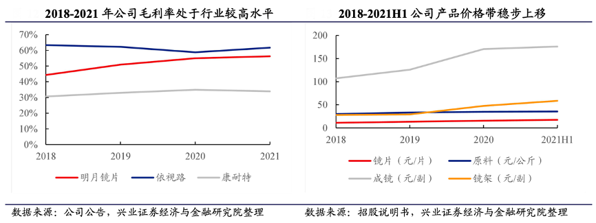 經(jīng)典案例:根據(jù)招股說明書、公司公告、興業(yè)證券經(jīng)濟(jì)與金融研究院等綜合資訊表明,明月鏡片公司毛利率穩(wěn)步提升,主要原因有:1)產(chǎn)品結(jié)構(gòu)優(yōu)化(高折射率鏡片、功能片占比提高)疊加品牌影響力提升帶來產(chǎn)品價(jià)格帶上移;2)2019 年開始,公司大力發(fā)展電商渠道銷售成鏡產(chǎn)品,隨著規(guī)模效應(yīng)的凸顯,成鏡產(chǎn)品單位成本持續(xù)下降。