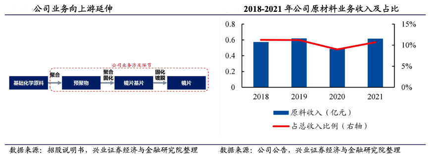經(jīng)典案例:根據(jù)招股說明書、公司公告、興業(yè)證券經(jīng)濟(jì)與金融研究院等綜合資訊表明,明月鏡片自主研發(fā)鏡片原料,打通產(chǎn)業(yè)鏈上游。2006 年,公司與韓國 KOC 合作設(shè)立工廠江 蘇可奧熙,研發(fā)并生產(chǎn)樹脂原料。同時(shí)公司與研究機(jī)構(gòu)合作,掌握了實(shí)驗(yàn)室制備 1.67 和 1.71 折射率樹脂單體的配方和制備流程。2021 年公司原料業(yè)務(wù) 收入 0.62 億元,占比 10.69%。