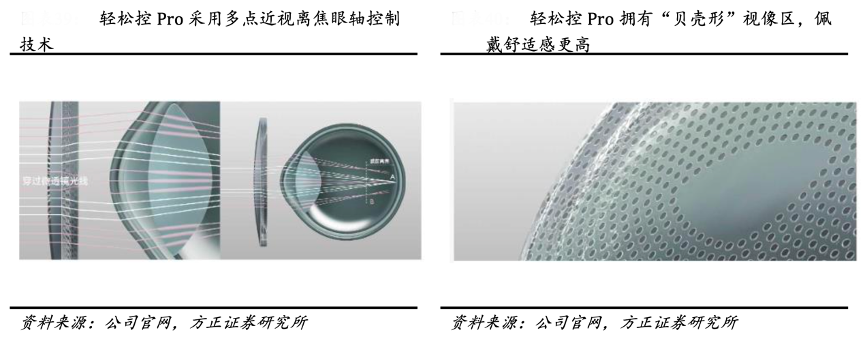 經(jīng)典案例:根據(jù)公司官網(wǎng)、方正證券研究所等綜合資訊表明,2021 年 12 月,明月鏡片公司推出“輕松控Pro”,產(chǎn)品采用多點(diǎn)近視離焦眼軸控制技術(shù),采用繁密的“滿天星”微透鏡排列,增加離焦面積,內(nèi)部雕刻高達(dá) 1295 個(gè)正度數(shù)微透鏡,使周邊區(qū)域成像落在視網(wǎng)膜前,從而形 成膜前離焦,進(jìn)而起到控制眼軸過(guò)快增長(zhǎng)的作用。輕松控 Pro 同時(shí)還 根據(jù)中國(guó)孩子“水平視野切換多、上下視野切換少”的用眼習(xí)慣,設(shè) 計(jì)出非對(duì)稱貝殼形視像區(qū),提升佩戴舒適感。
