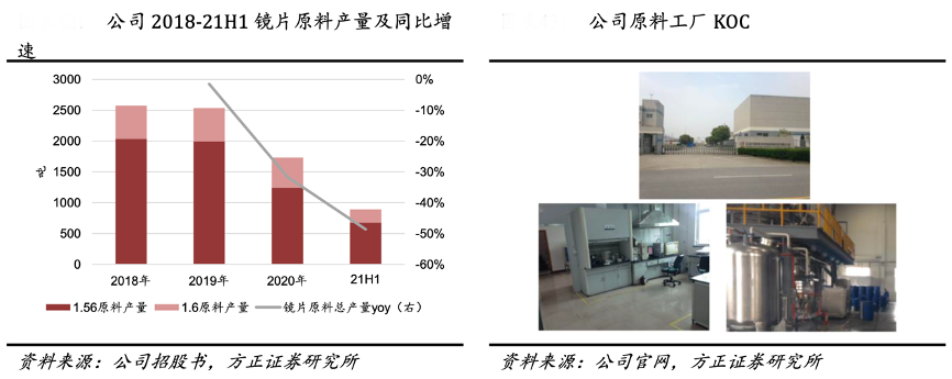 經(jīng)典案例:根據(jù)公司招股書、公司官網(wǎng)、方正證券研究所等綜合資訊表明,明月鏡片公司可自主生產(chǎn)折射率 1.56 及 1.60 系列的樹(shù)脂單體自用及對(duì)外銷 售,已掌握實(shí)驗(yàn)室制備 1.67 及 1.71 折射率鏡片相關(guān)樹(shù)脂單體的配方和制備流程,考慮到 1.67 及 1.71 型號(hào)高折樹(shù)脂單體的生產(chǎn)條件要求嚴(yán)格,從經(jīng)濟(jì)性角度選擇采購(gòu)而非自產(chǎn)。根據(jù)招股書披露,2018-21H1 公司鏡片原料總產(chǎn)能分別為 2527 噸、2536 噸、1733 噸、890 噸。