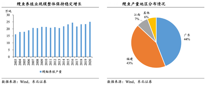 經典案例:根據wind、東北證券等綜合資訊表明,從時間維度來看,2003 年以來我國鰻魚產量總體保持著增長趨勢,借助于投苗節(jié)奏和養(yǎng)殖周期的把控,年產體量維持在 20 萬噸左右,相較于鰻苗捕撈量更加平穩(wěn)。從區(qū)域性來看,鰻魚養(yǎng)殖業(yè)主要分布于沿海城市,其中廣東和福建兩省鰻魚產量合計占我國鰻魚總產量的87%,其中廣東主要養(yǎng)殖日本鰻,而福建近兩年以美洲鰻為主要養(yǎng)殖品種。