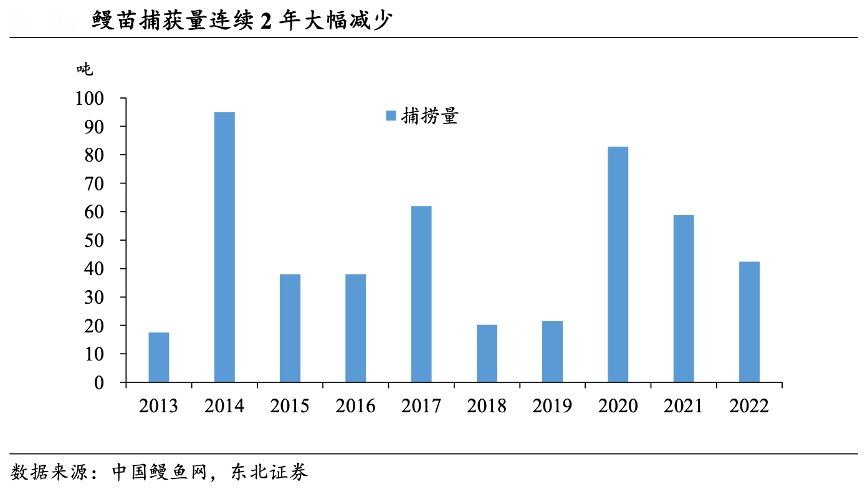 經典案例:根據中國鰻魚網、東北證券等綜合資訊表明,在經歷了 2020 年的 大豐收年后,2021-2022 年連續(xù)兩年捕撈季中鰻苗的捕撈量都出現了大幅下滑。2022 鰻苗捕撈季共捕獲鰻苗 42.45 萬噸,同比減少 27.81%。