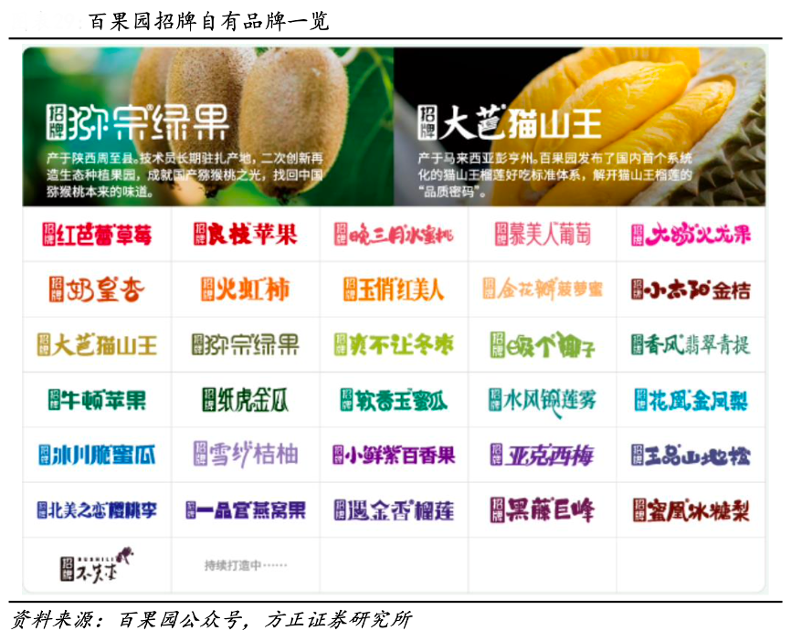 經(jīng)典案例:根據(jù)百果園公眾號(hào)、方正證券研究所等綜合資訊表明,百果園自有品牌產(chǎn)品越來(lái)越受消費(fèi)者青睞。截止 2023H1,公司共推出 35 個(gè)自有產(chǎn)品品 牌,零售額同比增長(zhǎng) 27%。相比 2022 年同期,自有品牌的零售額占百果園門(mén)店零 售總額達(dá)到 12%,2023 年提升至 14%。