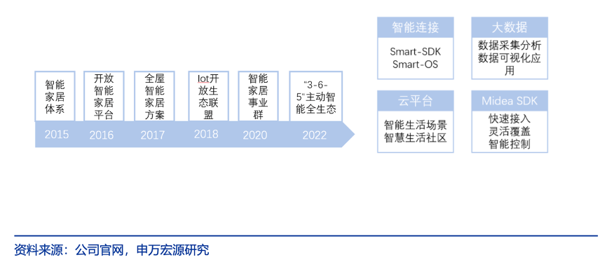 經(jīng)典案例:根據(jù)公司官網(wǎng)、申萬(wàn)宏源研究等綜合資訊表明,在智能家居的布 局上,美的于 2014 年提出 M-Smart 概念,開(kāi)始打造智能家居體系;2018 年推出 IoT 開(kāi) 放生態(tài)聯(lián)盟;2020 年正式將智能家居事業(yè)群作為營(yíng)收業(yè)務(wù)進(jìn)行統(tǒng)計(jì),2021 年智能家居事 業(yè)群實(shí)現(xiàn)收入 2349 億元,同比增長(zhǎng) 13%,占總營(yíng)收比例超過(guò) 68%;2022 年推出“3-6-5 主動(dòng)智能全生態(tài)”,逐鹿全屋智能解決方案。