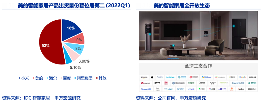 經(jīng)典案例:根據(jù)IDC智能家居、公司官網(wǎng)、申萬(wàn)宏源研究等綜合資訊表明,美的概念始終走在前沿,2022 年推出的全屋智能解決方案引領(lǐng)行業(yè)向主動(dòng)智能跨越;與華為合作搭載鴻蒙 OS 系統(tǒng),也為智能家居各陣營(yíng)廠商未來(lái)的聯(lián)合方式提供了范例。同時(shí),根據(jù) IDC 智能家居數(shù)據(jù),2022Q1 年美的智能家居產(chǎn)品出貨量占比 9.0%,僅次于小米,位居第二。