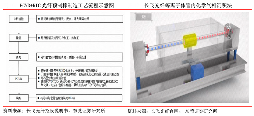 經(jīng)典案例:根據(jù)長(zhǎng)飛光纖招股說明書、東莞證券研究所等綜合資訊表明,長(zhǎng)飛光纖是國(guó)內(nèi)第一家擁有光纖預(yù)制棒生產(chǎn)能力的企業(yè),公司掌握的“PCVD+RIC”光纖預(yù) 制棒生產(chǎn)技術(shù)處于世界領(lǐng)先水平,能夠?qū)饫w的折射率剖面進(jìn)行精確控制。公司使用的光纖 RIC 工藝,是以 PCVD 工藝為基礎(chǔ)延續(xù)光纖預(yù)制棒 PCVD+RIC 工藝的一 種技術(shù),大尺寸光纖預(yù)制棒可以進(jìn)一步降低光纖的衰減,在提高光纖質(zhì)量和降低光纖成本方面具有突出優(yōu)勢(shì)。