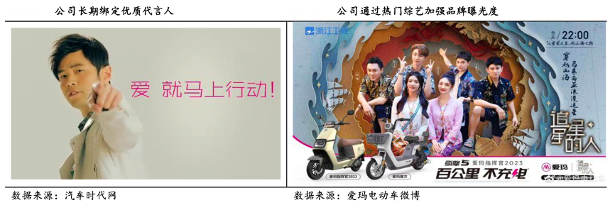 經(jīng)典案例:根據(jù)汽車時代網(wǎng)、愛瑪電動車微博、國泰君安證券研究等綜合資訊表明,愛瑪自 2009 年起深度綁定周杰倫作為品牌代言人,彰顯公司品質(zhì)如一的可 靠形象。同時,愛瑪自 2021 年起開啟多樣化廣告投放,在線下全方位滲透消費(fèi)者的出行場景,包括高鐵廣告、社區(qū)廣告以及地鐵廣告等,2023 年通過攜手《披荊斬棘 3》、《乘風(fēng) 2023》、《青春飛一般》、《追星星的人》等頂流綜藝,實(shí)現(xiàn)“產(chǎn)品露出+明星效應(yīng)+品牌價值+銷 量轉(zhuǎn)化”的全維共贏。