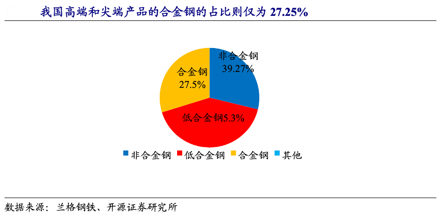 經(jīng)典案例:根據(jù)蘭格鋼鐵、開源證券研究所等綜合資訊表明,特鋼的應(yīng)用領(lǐng)域十分廣泛,包括國防、電力、石油化工、核電、汽車等。在我國特鋼產(chǎn)品中,2023Q1-3,在重點(diǎn)優(yōu)特鋼產(chǎn)品結(jié)構(gòu)中,中低端產(chǎn)品主要集中在非合金鋼和低合金鋼上,占比高達(dá) 72.5%。而集中在高端和尖端產(chǎn)品的合 金鋼的占比則僅為 27.25%。