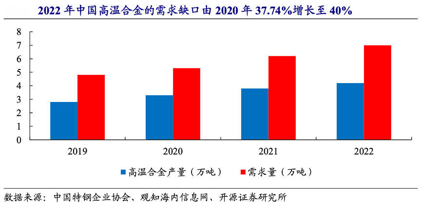經(jīng)典案例:根據(jù)中國特鋼企業(yè)協(xié)會、觀知海內(nèi)信息網(wǎng)、開源證券研究所等綜合資訊表明,我國高溫合金行業(yè)從業(yè)企業(yè)數(shù)量較少,整體產(chǎn)能、產(chǎn)量較小,長期依賴進(jìn)口且 處于供不應(yīng)求狀態(tài),盡管過去十年高溫合金的供應(yīng)量實(shí)現(xiàn)了大幅增長,但供需差距依舊在持續(xù)擴(kuò)大。2022 年中國高溫合金的需求缺口由 2020 年 37.74%增長至 40%。減少對進(jìn)口的依賴并加快國產(chǎn)替代,成為國內(nèi)高溫合金行業(yè)面臨的主要挑戰(zhàn)之一。
