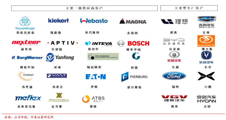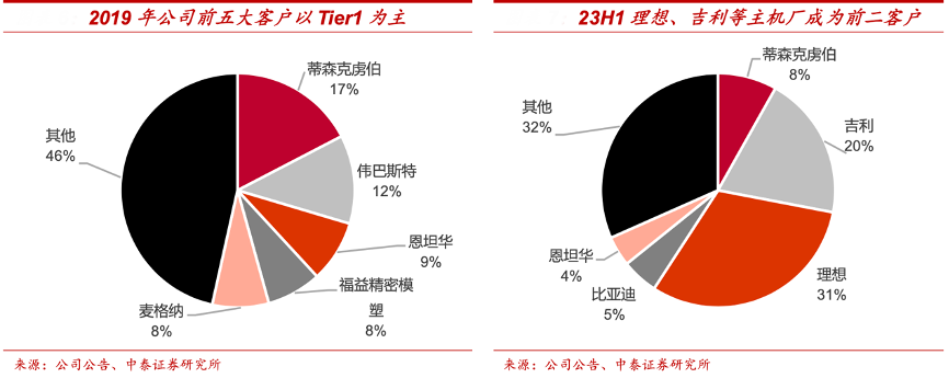經(jīng)典案例:根據(jù)公司公告、中泰證券研究所等綜合資訊表明,博俊科技公司重慶工廠擁有眾多整車(chē)廠客戶:長(zhǎng)安、吉利、理想、賽力斯等,自 2021 年重慶工廠投產(chǎn)后,相關(guān)客戶配套車(chē)型陸續(xù)投入量產(chǎn),客戶結(jié)構(gòu)發(fā)生顯著變化,2019 年公司前五大客戶都是 Tier1,2023 年上半年理想、吉利收入占比 分別達(dá)到 31%、20%,成為前二大客戶。