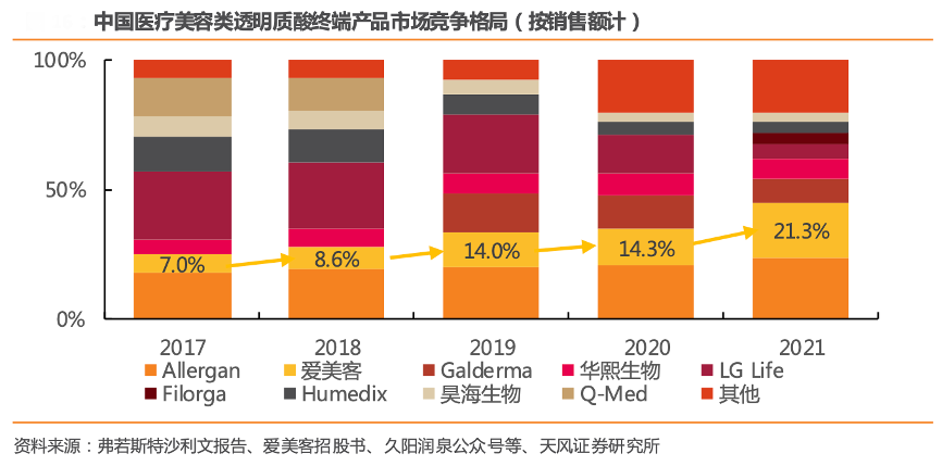 經(jīng)典案例:根據(jù)弗若斯特沙利文報告、愛美客招股書、久陽潤泉公眾號、天風證券研究所等綜合資訊表明,愛美客公司圍繞玻尿酸填充劑領(lǐng)域深耕,從逸 美開始 不 斷擴充產(chǎn)品矩陣、改善注射感受(愛芙萊),并伴隨產(chǎn)品迭代升級(逸美→逸美一加一) 及適應癥拓展(截止 23H1 逸美一加一正進行新填充部分適應癥臨床試驗)等等,產(chǎn)品合規(guī)化、豐富度及差異化優(yōu)勢明顯,市占率持續(xù)提升。弗若斯特沙利文數(shù)據(jù)顯示,2021 年國內(nèi)透明質(zhì)酸醫(yī)美終端 市場本土頭部三品牌銷售額占比 32.8%,其中公司市場份額提升最為明顯,按銷售額計市 占率已從 2017 年的 7.0%提升到了 2021 年的 21.3%。