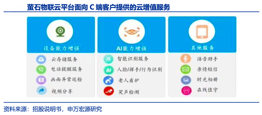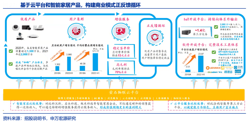 經(jīng)典案例:根據(jù)招股說明書、申萬宏源研究等綜合資訊表明,螢石基于強(qiáng)大的云平臺(tái)能力,形成“優(yōu)質(zhì)產(chǎn)品引流——積累用戶基數(shù)——增值服務(wù)帶來高毛利”的商業(yè)模式,構(gòu)成正反饋循環(huán)。對比其他競爭對手,形成價(jià)值周期更長的盈利模式;以視覺能力為特色,滿足用戶多元化需求,具備獨(dú)特優(yōu)勢。