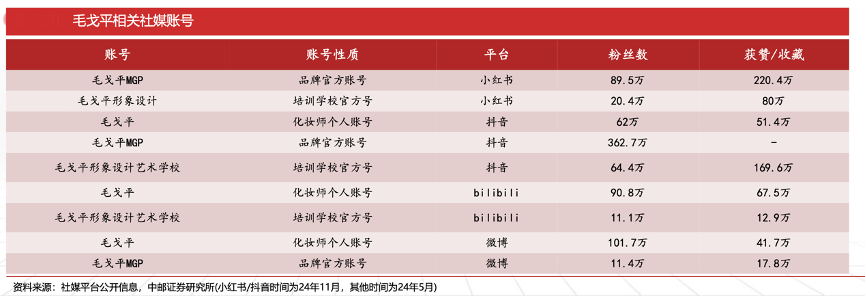 經(jīng)典案例:根據(jù)社媒平臺公開信息、中郵證券研究所等綜合資訊表明,毛戈平個人B站賬號于2020年開始運作,通過發(fā)布化妝干貨視頻+達人合作推廣打造個人IP,視頻中使用毛戈平品牌產(chǎn)品,為品牌營銷發(fā)力;截至2024年5月, 毛戈平個人b站賬號發(fā)布作品16條,獲贊67.5萬,平均每個作品獲贊量高達4.2萬,視頻用戶認可度高。