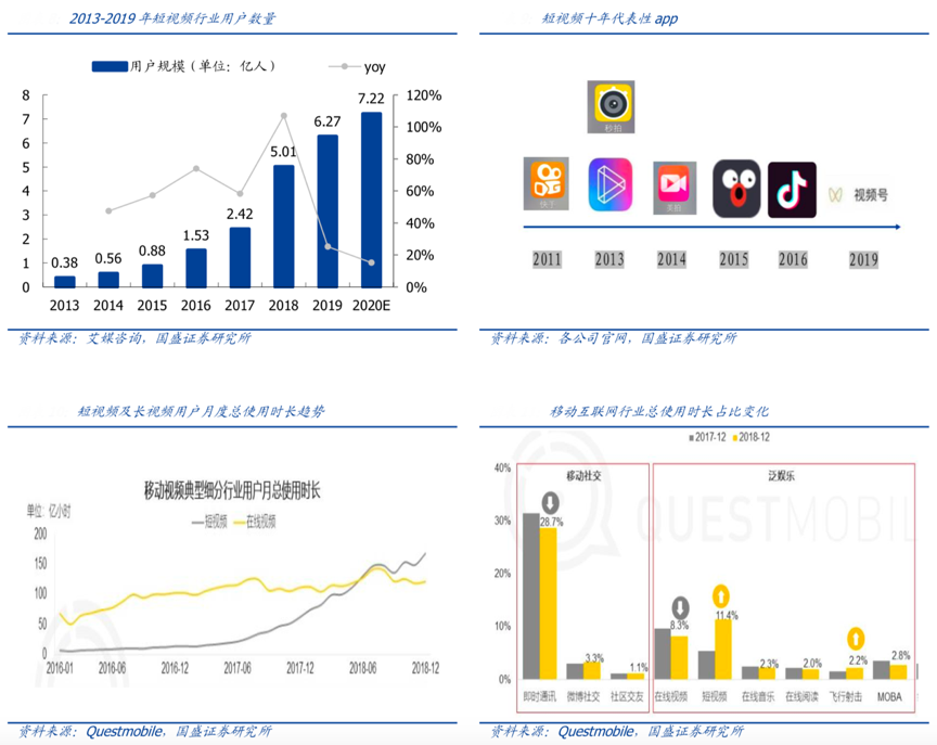經(jīng)典案例:根據(jù)QuestMobile、艾媒咨詢、各公司官網(wǎng)、國(guó)盛證券研究所等綜合資訊表明,抖音入局后行業(yè)發(fā)展活躍,用戶規(guī)模從 1.53 億增長(zhǎng)至 5 億以上,同時(shí)短視頻的時(shí)長(zhǎng)占比極速提升,截止 2018 年 12 月,短視頻使用時(shí)長(zhǎng)占比大幅提升至 11.4%,對(duì)即時(shí)通訊、長(zhǎng)視頻等行業(yè)形成沖擊。PGC、MCN 入局短視頻,此時(shí)憑借強(qiáng)運(yùn)營(yíng)能力、中心化算法的抖音快速增長(zhǎng),秒拍、小咖秀、美拍、微視相繼隕落,形成以強(qiáng)算法、強(qiáng)內(nèi)容的抖音、快手為主的短視頻行業(yè)格局。