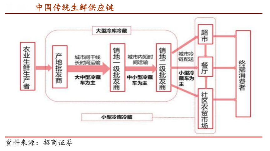 經典案例:據招商證券等資訊顯示,叮咚買菜的供應鏈經過三段運輸:首先產品從源頭出發(fā),經冷鏈運輸到城市分選中心,之后再運輸到前置倉,最后用末端配送把商品配送到用戶家里。整條供應鏈為用戶創(chuàng)造了三段價值:從源頭到分選中心,實現 B2B 生鮮電商的價值;從分選中心到前置倉,實現生鮮超市做的價值;從前置倉配送到用戶家里,實現外賣平臺的價值。