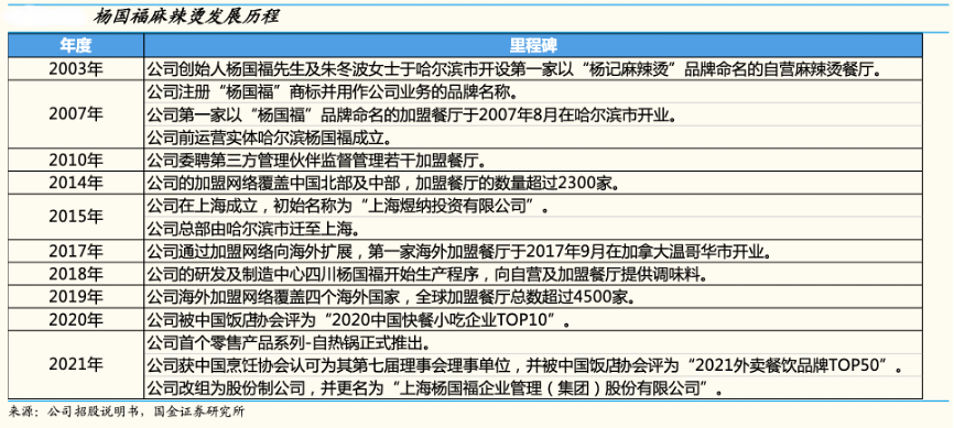 經(jīng)典案例:根據(jù)公司招股說明書、國金證券研究所等綜合資訊表明,楊國福公司成立于 2003 年,歷經(jīng) 19 年的發(fā)展,創(chuàng)新打造“可以喝的麻辣燙”湯底配方、“斤式自選”服務(wù)模式和“單人單鍋”烹飪方式,重塑消費(fèi)者對麻辣燙的觀感。根據(jù)弗若斯特沙利文數(shù)據(jù),按商品交易總額以及餐廳數(shù)量計算,2020年公司以 49 億商品交易額、5238 家門店在國內(nèi)中式快餐市場排名第一,市占率約 0.7%。