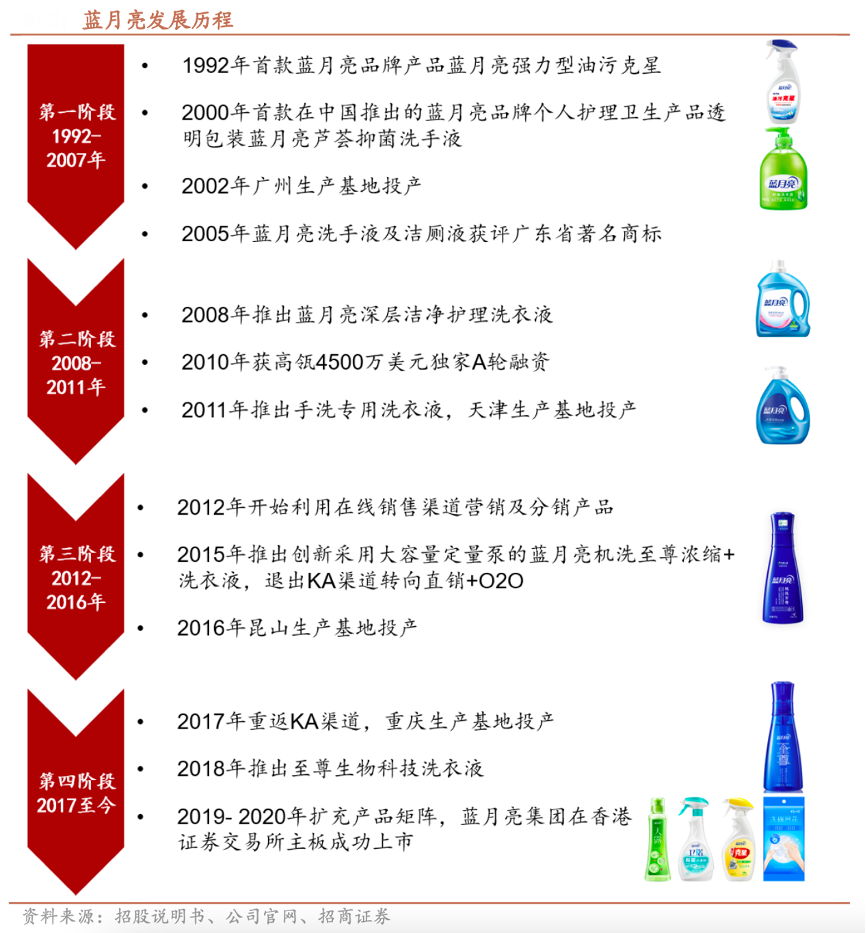 經(jīng)典案例:根據(jù)招股說明書、公司官網(wǎng)、招商證券等綜合資訊表明,藍(lán)月亮于2008年在全國率先推廣洗衣液,改變十余億中國人的洗衣習(xí)慣,推動洗衣粉轉(zhuǎn)向洗衣液的跨越式升級;于2011年推出藍(lán)月亮手 洗專用洗衣液,倡導(dǎo)專品專用清潔理念;于2015年推出藍(lán)月亮機(jī)洗至尊濃縮+洗衣液,在國內(nèi)屬采用濃縮技術(shù)的第一梯隊,再次推動中國洗滌行業(yè)市場變革,由普通型洗衣液跨越升級為濃縮型洗衣液。