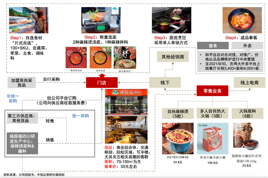 經(jīng)典案例:根據(jù)公司招股書、中信證券研究部等綜合資訊表明,楊國福自研、自產(chǎn)底料,餐飲零售雙注重,活化用戶的消費場景。