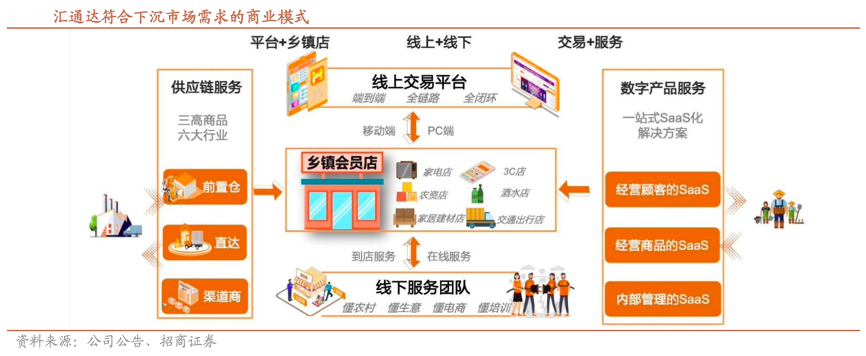 經(jīng)典案例:根據(jù)公司公告、招商證券等綜合資訊表明,匯通達(dá)布局鄉(xiāng)鎮(zhèn)市場(chǎng),主要經(jīng)營(yíng)三高類商品, 并通過(guò)線上+線下相結(jié)合的方式對(duì)供應(yīng)鏈及 SaaS 產(chǎn)品賦能,向會(huì)員零售門(mén)店提供服務(wù),僅有 To B 業(yè)務(wù),利用公司近 3000 人的線下專業(yè)團(tuán)隊(duì)針對(duì)下沉市場(chǎng)零售門(mén)店痛點(diǎn)制定解決方案,與國(guó)家?guī)头鑫⑿∑髽I(yè)、鄉(xiāng)村振興導(dǎo)向相同。