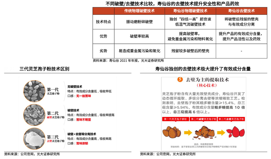 經(jīng)典案例:根據(jù)壽仙谷2021年年報(bào)、公司官網(wǎng)、光大證券研究所等綜合資訊表明,壽仙谷自主研發(fā)的破壁與去壁技術(shù)不僅使得產(chǎn)品安全性更高,也使得有效成分含量遠(yuǎn)高于同行。2018年公司取得了靈芝孢子粉去壁技術(shù)中國發(fā)明專利,相關(guān)技術(shù)也在美國、日 本、南非獲得授權(quán),建立了防范性壁壘。