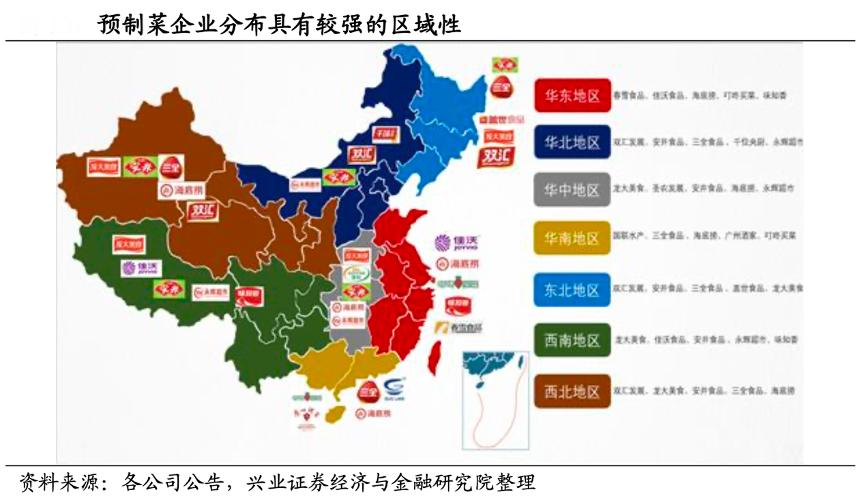 經(jīng)典案例:根據(jù)各公司公告、興業(yè)證券經(jīng)濟(jì)與金融研究院等綜合資訊表明,我國(guó)地大物博、人口眾多,各地區(qū)口味不一,催生出多種地方菜系,標(biāo)準(zhǔn)化難度較高。同時(shí)預(yù)制菜主要依靠冷鏈運(yùn)輸,而當(dāng)前相關(guān)企業(yè)規(guī)模尚小,全國(guó)化產(chǎn)能布局尚未完成。產(chǎn)能布局和冷鏈運(yùn)輸具有限制,疊加口味區(qū)域化特征,目前預(yù)制菜企業(yè)主要覆蓋部分地區(qū),行業(yè)內(nèi)尚未出現(xiàn)全國(guó)性龍頭。
