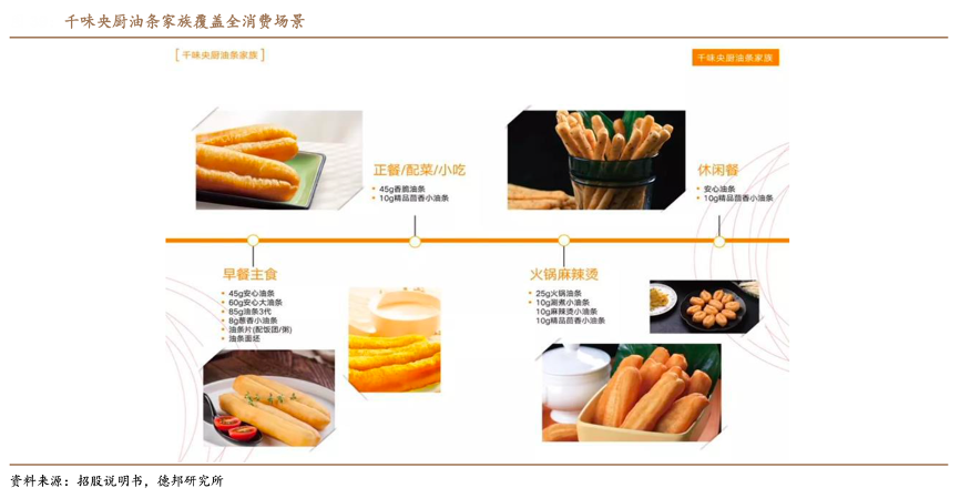經(jīng)典案例:根據(jù)招股說明書、德邦研究所等綜合資訊表明,千味央廚公司依托現(xiàn)有產(chǎn)品進 行場景化的深入研究,研發(fā)出適應不同消費場景的系列產(chǎn)品。以油條為例,公司從 2012 年開始進行油條細分場景下的市場研究,細分出火鍋、快餐、自助餐、宴席、早餐、外賣六大場景,并針對性推出茴香小油條、麻辣燙小油條、火鍋涮煮油條、外賣專用油條等多款創(chuàng)新性產(chǎn)品。