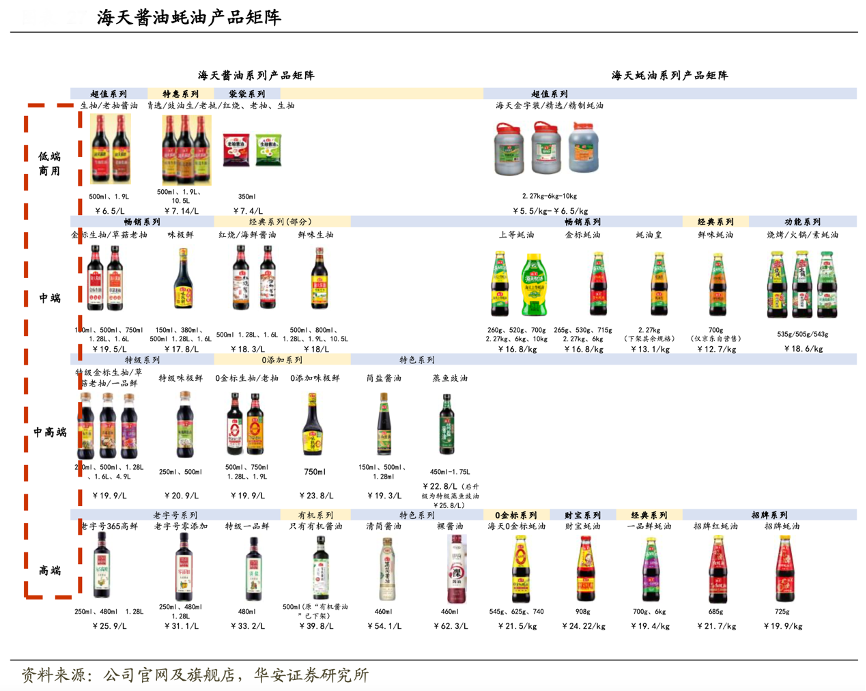 經(jīng)典案例:根據(jù)公司官網(wǎng)及旗艦店、華安證券研究所等綜合資訊表明,以醬油為例,海天產(chǎn)品2014 年指向高端化和細(xì)分化,升級“海天金標(biāo)醬油”為“特級金標(biāo)”系列,推出高端產(chǎn)品“老字號系列”醬油,投放“365 極鮮”“零添加”“低鹽”等新品,目前該系列醬油已成為營收過億單品。2021年其打造“0 系列”:0金標(biāo)生抽、0添加草菇老抽、0添加味極鮮。2022年其升級海天有機(jī)醬油。