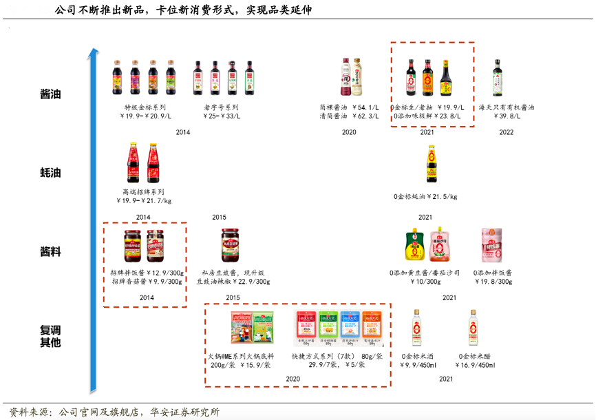 經(jīng)典案例:根據(jù)公司官網(wǎng)及旗艦店、華安證券研究所等綜合資訊表明,海天公司于 2014 年上新招牌拌飯醬、2015年上新私房豆豉醬,并于 2020 年上新火鍋@ME系列,跨入復(fù)調(diào)賽道,不斷實現(xiàn)品類延伸。