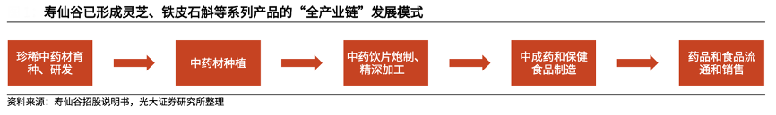 經(jīng)典案例:根據(jù)壽仙谷招股說明書、光大證券研究所等綜合資訊表明,壽仙谷的前身是 1994 年成立的武義縣金星食用菌公司,公司于2008年更名為浙江壽仙谷生物科技有限公司,2013 年整體變更為股份有限公司,于2017年在上交所上市,是一家專業(yè)從事靈芝、鐵皮石斛、西紅花等名貴中藥材的品種選育、栽培、加工和銷售的國家高新技術企業(yè),擁有“全產(chǎn)業(yè)鏈”發(fā)展優(yōu)勢。