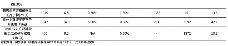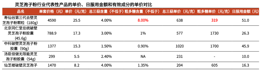 經(jīng)典案例:根據(jù)阿里健康、光大證券研究所等綜合資訊表明,在同類的靈芝孢子粉中,壽仙谷的主打產(chǎn)品第三代去壁靈芝孢子粉的有效成分含量(靈芝三萜、靈芝多糖) 超越同行,特別是粗多糖(具有抑制腫瘤和增加機體免疫力的功能),雖然其單價與日服用金額也是同類產(chǎn)品中最高的,但是有效成分的性價比高。