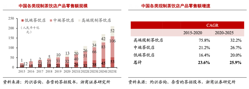 經(jīng)典案例:根據(jù)灼識(shí)咨詢、奈雪的茶招股書、浙商證券研究所等綜合資訊表明,從零售額占比來看,2020 年中國高端現(xiàn)制茶飲零售額占中國整體現(xiàn)制茶飲的 19.7%,截至 2020 年 12 月 31 日,中國約有 34.8 萬間現(xiàn)制茶飲店,其中高端現(xiàn)制茶飲店約 3400 家,中端約 14.15 萬家,低端約 20.35 萬家,高端門店數(shù)量占比約1%,結(jié)合零售額占比,高端茶飲店平均店效遙遙領(lǐng)先。
