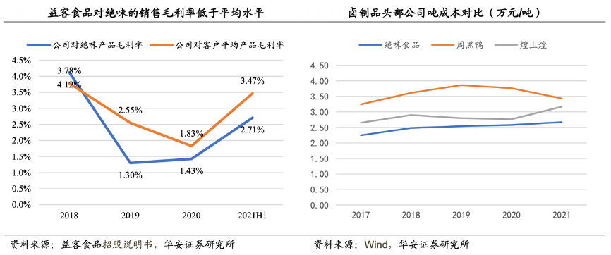 經典案例:根據(jù)益客食品招股說明書、wind、華安證券研究所等綜合資訊表明,絕味公司通過產業(yè)投資向產業(yè)鏈上游延伸,加強對原材料成本的控制能力。被投企業(yè)包括肉鴨全產業(yè)鏈大型企業(yè)——內蒙古塞飛亞農業(yè)科技公司,以及調味品、醬料、油脂等 生產公司幺麻子等。2021 年公司向塞飛亞及幺麻子采購原材料金額分別為6112.0/429.2 萬元。從公司成本結構來看,直接材料占比在 80%以上,公司的原材料采購優(yōu)勢有助于降低整體營業(yè)成本。與同行主要競爭對手相比,絕味的鹵制品生產平均成本更低。