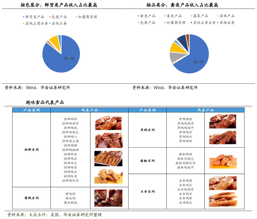 經典案例:根據(jù)wind、大眾點評、美團、華安證券研究所等綜合資訊表明,絕味食品主要從事休閑鹵制食品的開發(fā)、生產與銷售,根據(jù)品類劃分,涵蓋肉制品、蔬菜、水產品、豆制品等,其中以鴨脖為代表的禽肉制品為公司貢獻最大比例的銷售收入;根據(jù)口味劃分,公司產品可細分為“招牌系列”“黑鴨系列”“醬鴨系列”“五香系列”“藤椒系列”等不同口 味,可滿足消費者的不同偏好。