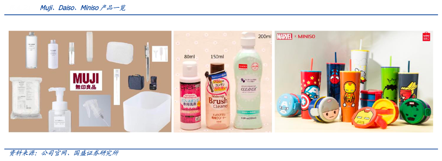 經(jīng)典案例:根據(jù)公司官網(wǎng)、國盛證券研究所等綜合資訊表明,從門店設(shè)定、產(chǎn)品對比以及品牌輸出來看,Daiso、Muji 以及 Miniso 已出現(xiàn)差異化定位,從消費(fèi)者反饋來看,Daiso與Watts為代表的百元店突出性價(jià)比、實(shí)用、產(chǎn)品使用感至上,而 Muji 更側(cè)重于簡約、精致的生活理念傳播,名創(chuàng)優(yōu)品通過 IP 聯(lián)名、子品牌TOPTOY的矩陣搭建,則逐漸形成以興趣為核心的品牌內(nèi)核。