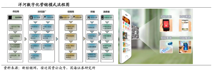 經(jīng)典案例:根據(jù)新經(jīng)銷網(wǎng)、宿遷國資公眾號、國海證券研究所等綜合資訊表明,洋河“數(shù)字化營銷模式”通過數(shù)字化掃碼掌握消費(fèi)者實際開瓶數(shù)據(jù)、及渠道(經(jīng)銷 商、煙酒店)進(jìn)出庫數(shù)據(jù),獲知需求端及渠道端數(shù)據(jù),已實現(xiàn)掌握消費(fèi)者實際 需求情況以匹配供給端發(fā)貨,形成市場供求關(guān)系長期緊平衡的目的,并進(jìn)一步保障了控盤分利制度的落地,維持經(jīng)銷商積極性。