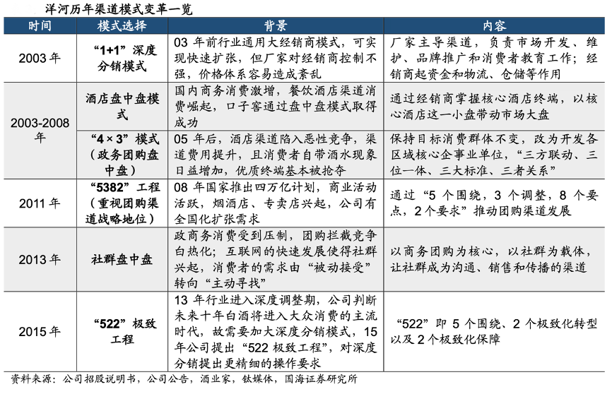 經(jīng)典案例:根據(jù)公司招股說明書、公司公告、酒業(yè)家、鈦媒體、國海證券研究所等綜合資訊表明,洋河渠道端采取深度分銷、“消費(fèi)者盤中盤”等模式,并隨行業(yè)的發(fā)展不斷迭代渠道營銷方式,公司首次將快消品深度分銷的概念引入白酒渠道,陸續(xù)推出酒店盤中盤、“4×3”、“5382”工程和“522”極致工程等營銷方式,之后公司走出江蘇,基本實現(xiàn)泛全國化,2015 年省外營收占比即提升至約 40%。