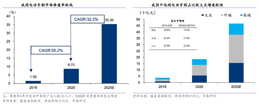 經(jīng)典案例:根據(jù)薇美姿招股書、弗若斯特沙利文、華泰研究等綜合資訊表明,我國電動牙刷滲透率明顯偏低,電動牙刷單位零售價 250 元-600 元的中端電動牙刷的零售額占我國電動牙刷市場最大份額,2020年占比45%。由于我國電動牙刷滲透率較低,單位零售價低于 250 元的大眾市場增長最快,2016 年至 2020 年復(fù)合增長率達57.9%。
